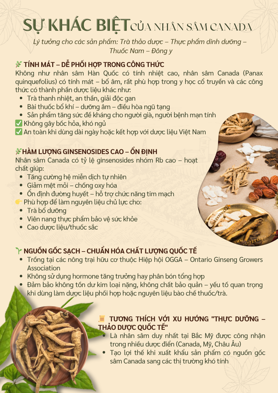 Với dược tính đa năng, nhân sâm Canada là lựa chọn vừa truyền thống, vừa hiện đại – lý tưởng để phát triển trà thảo dược, sản phẩm Đông y và thực phẩm hỗ trợ sức khỏe mang lại hiệu quả cao, an toàn và phù hợp xu hướng sống khỏe tự nhiên.
