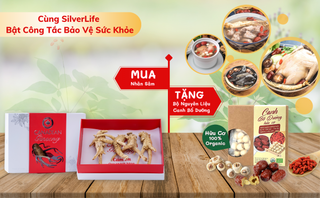 Khi mua Nhân sâm Canada SilverLife trị giá từ 1.000.000 đ, quý khách sẽ nhận quà tặng là 1 hộp nguyên liệu Canh Bổ Dưỡng gồm táo tàu hữu cơ, hạt sen hữu cơ, kỷ tử hữu cơ trị giá 79,000